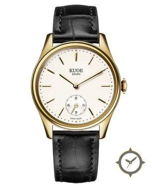 A Dress watch with a vintage-inspired 36mm case, crafted from gold featuring a white dial with a unique smooth lacquer finish.