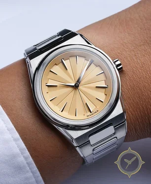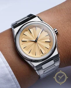 A Sports watch with a vintage-inspired 37mm case, crafted from stainless steel featuring a gold dial with a unique faceted sunburst (geometric facets) finish.