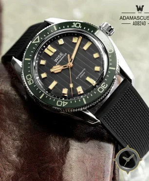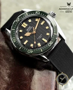 A Dive watch with a vintage-inspired 35mm case, crafted from stainless steel featuring a black dial with a unique vertical teak-style striping finish.