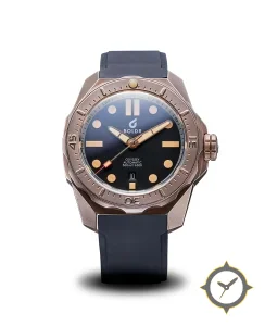 A Dive watch with a bold 52.5mm presence on the wrist, crafted from bronze featuring a navy dial with a unique matte with subtle sunburst gradient finish.