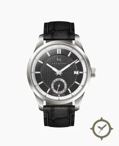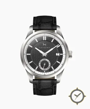 A Dress watch with a vintage-inspired 33mm case, crafted from stainless steel featuring a black dial with a unique textured guilloché / basket-weave center with concentric ring outer track finish.