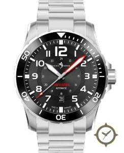 A Dive watch with a vintage-inspired 36.5mm case, crafted from stainless steel featuring a black dial with a unique brushed with concentric rings finish.
