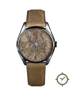 A Vintage watch with a vintage-inspired 36mm case, crafted from stainless steel featuring a brown dial with a unique relief carved map / topographic texture finish.