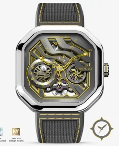A Skeleton watch with a bold 42.5mm presence on the wrist, crafted from stainless steel featuring a gray dial with a unique brushed metal with openworked/skeleton cutouts and layered plates finish.