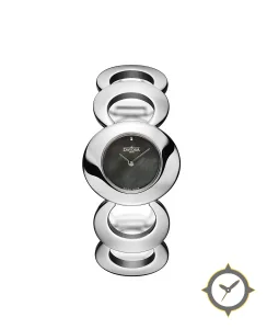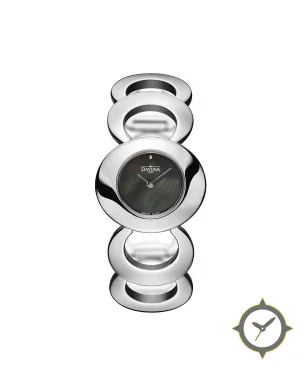 A Dress watch with a vintage-inspired 30.5mm case, crafted from stainless steel featuring a black dial with a unique mother-of-pearl finish.
