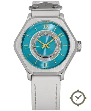 A Dress watch with a vintage-inspired 37mm case, crafted from stainless steel featuring a turquoise dial with a unique sunburst finish.
