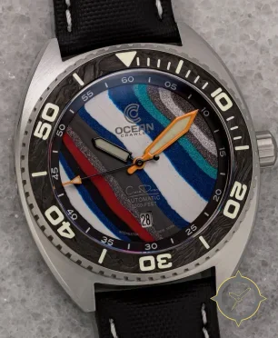 A Dive watch with a bold 52mm presence on the wrist, crafted from stainless steel featuring a blue dial with a unique multi-color striped/marbleized finish with metallic glitter finish.