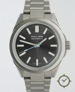 A Sports watch with a vintage-inspired 33mm case, crafted from stainless steel featuring a gray dial with a unique sunburst finish.