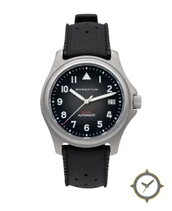 A Field watch with a versatile 38.5mm case, that suits most wrists, crafted from stainless steel featuring a black dial with a unique matte with slight gradient finish.