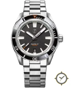 A Dive watch with a vintage-inspired 33.5mm case, crafted from stainless steel featuring a black dial with a unique grainy / sandblasted texture finish.