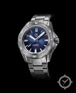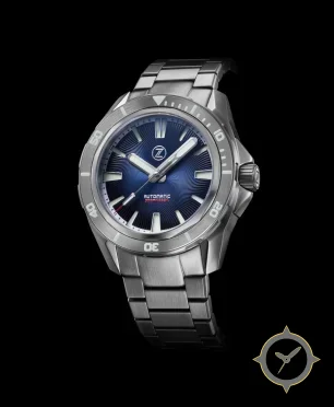 A Dive watch with a bold 47.5mm presence on the wrist, crafted from stainless steel featuring a blue dial with a unique sunburst wave guilloche finish.