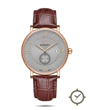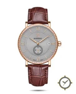A Dress watch with a vintage-inspired 36mm case, crafted from gold featuring a silver dial with a unique sunburst center with guilloche outer ring finish.