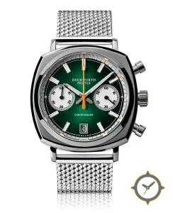 A Chronograph watch with a versatile 40mm case, that suits most wrists, crafted from stainless steel featuring a green dial with a unique sunburst finish.