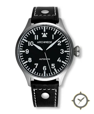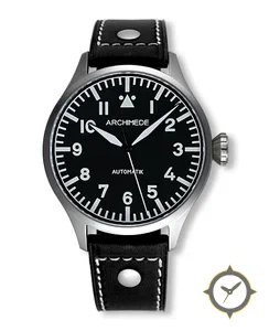 A Pilot watch with a bold 45mm presence on the wrist, crafted from stainless steel featuring a black dial with a unique matte finish.