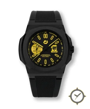 A Chronograph watch with a vintage-inspired 32.5mm case, crafted from stainless steel featuring a black dial with a unique textured matte/grain finish.