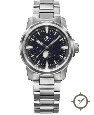 A Sports watch with a versatile 39mm case, that suits most wrists, crafted from stainless steel featuring a navy dial with a unique aventurine (sparkling, starfield) finish and a beautiful moonphase display.