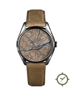 A Field watch with a versatile 39.5mm case, that suits most wrists, crafted from stainless steel featuring a brown dial with a unique textured relief (engraved map / cracked leather look) finish.