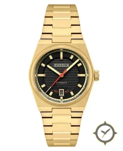 A Luxury watch with a versatile 38.5mm case, that suits most wrists, crafted from gold featuring a black dial with a unique horizontal ribbed / grooved finish.