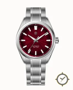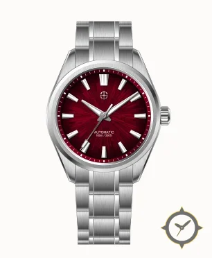 A Sports watch with a vintage-inspired 33.5mm case, crafted from stainless steel featuring a crimson dial with a unique sunburst finish.