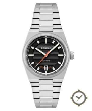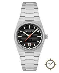 A Sports watch with a bold 49.5mm presence on the wrist, crafted from stainless steel featuring a black dial with a unique horizontal ribbed / grooved texture in center with smooth outer chapter ring finish.