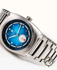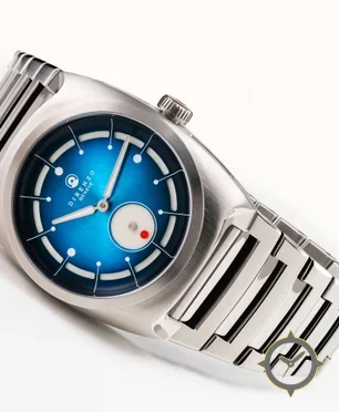 A Sports watch with a vintage-inspired 37.5mm case, crafted from stainless steel featuring a blue dial with a unique sunburst finish.