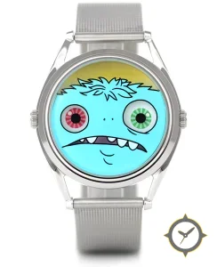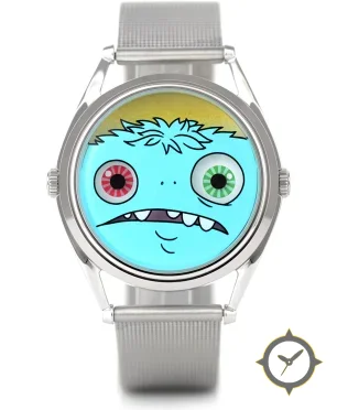 A Minimalist watch with a versatile 38mm case, that suits most wrists, crafted from stainless steel featuring a turquoise dial with a unique printed cartoon illustration with slight gloss finish.