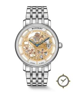 A Skeleton watch with a bold 44mm presence on the wrist, crafted from stainless steel featuring a gold dial with a unique open-worked (skeletonized) finish.