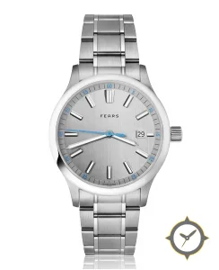 A Sports watch with a bold 43.5mm presence on the wrist, crafted from stainless steel featuring a silver dial with a unique brushed finish.