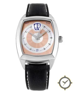 A Dress watch with a vintage-inspired 28mm case, crafted from stainless steel featuring a white dial with a unique guilloche concentric pattern finish.