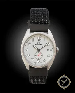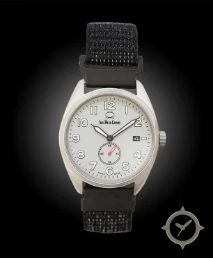 A Field watch with a bold 44mm presence on the wrist, crafted from stainless steel featuring a white dial with a unique matte finish.
