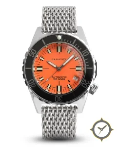 A Dive watch with a vintage-inspired 33mm case, crafted from stainless steel featuring a orange dial with a unique matte finish.