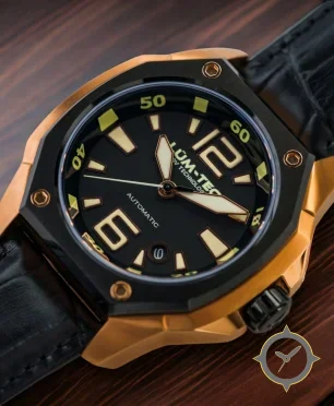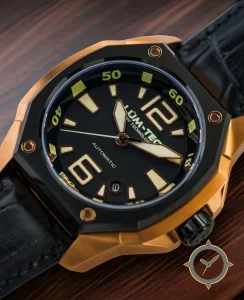 A Dive watch with a versatile 39mm case, that suits most wrists, crafted from bronze featuring a black dial with a unique matte finish.