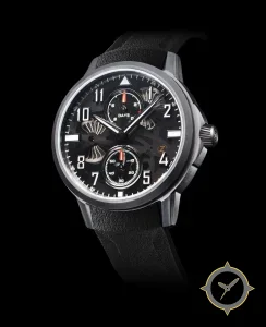 A Pilot watch with a bold 50mm presence on the wrist, crafted from stainless steel featuring a black dial with a unique open-worked/skeletonized finish and a helpful power reserve indicator.