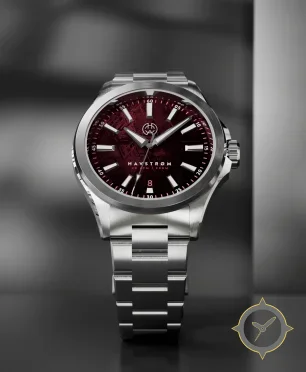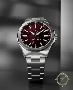 A Sports watch with a vintage-inspired 32.5mm case, crafted from stainless steel featuring a crimson dial with a unique meteorite-style textured finish finish.
