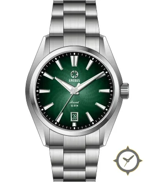 A Sports watch with a vintage-inspired 34mm case, crafted from stainless steel featuring a green dial with a unique guilloché sunburst finish.
