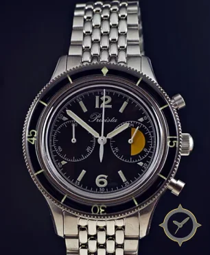 A Chronograph watch with a vintage-inspired 37mm case, crafted from stainless steel featuring a black dial with a unique glossy finish.