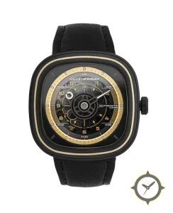 A Skeleton watch with a bold 41.5mm presence on the wrist, crafted from stainless steel featuring a black dial with a unique open-work / multi-layered with exposed movement and gold-plated accents finish.
