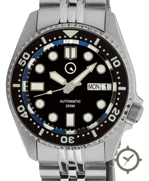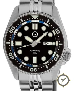 A Dive watch with a bold 44mm presence on the wrist, crafted from stainless steel featuring a black dial with a unique glossy finish.