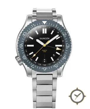 A GMT watch with a vintage-inspired 31mm case, crafted from stainless steel featuring a black dial with a unique glossy finish and a true GMT complication for tracking a second time zone.