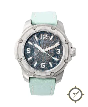 A Sports watch with a bold 42.5mm presence on the wrist, crafted from stainless steel featuring a blue dial with a unique damascus-style textured finish.