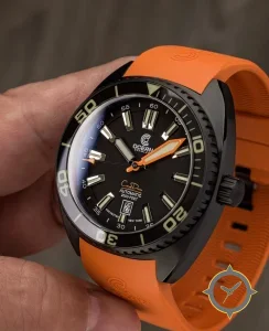 A Dive watch with a bold 48.5mm presence on the wrist, crafted from stainless steel featuring a black dial with a unique matte finish.