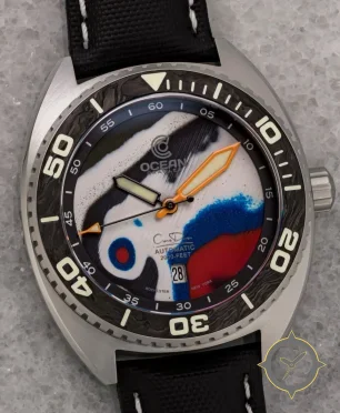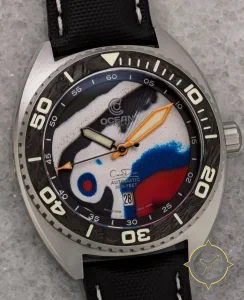 A Dive watch with a versatile 40mm case, that suits most wrists, crafted from stainless steel featuring a white dial with a unique marbled / painted splash finish finish.