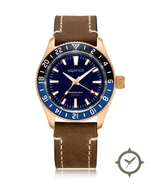 A GMT watch with a vintage-inspired 37.5mm case, crafted from gold featuring a navy dial with a unique aventurine (sparkling) finish and a true GMT complication for tracking a second time zone.