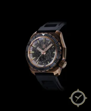 A Dive watch with a bold 53mm presence on the wrist, crafted from bronze featuring a black dial with a unique textured (meteorite-style) finish.