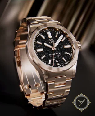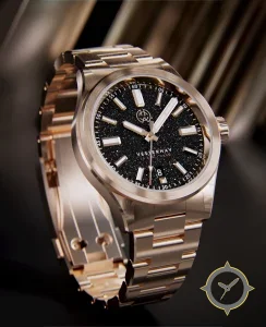 A Sports watch with a bold 42mm presence on the wrist, crafted from gold featuring a black dial with a unique sparkle/granulated (starfield) finish.