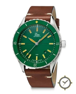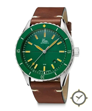 A Dive watch with a vintage-inspired 36mm case, crafted from stainless steel featuring a green dial with a unique matte finish.