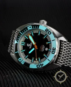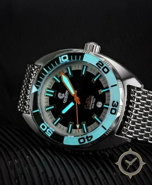 A Dive watch with a vintage-inspired 37.5mm case, crafted from stainless steel featuring a black dial with a unique glossy finish.