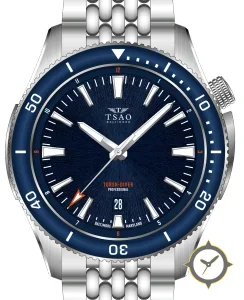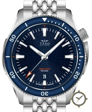 A Dive watch with a bold 49.5mm presence on the wrist, crafted from stainless steel featuring a navy dial with a unique radial sunburst / brushed finish.