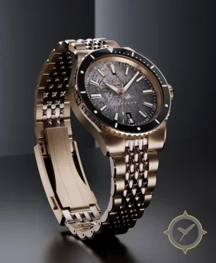 A Dive watch with a bold 42.5mm presence on the wrist, crafted from gold featuring a gray dial with a unique meteorite textured finish finish.