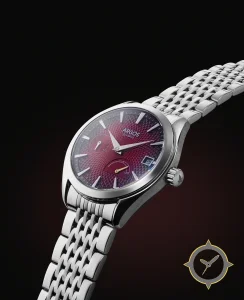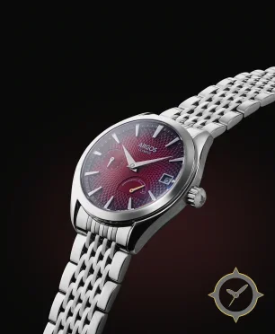 A Dress watch with a versatile 38mm case, that suits most wrists, crafted from stainless steel featuring a red dial with a unique guilloché (hobnail) texture finish and a helpful power reserve indicator.